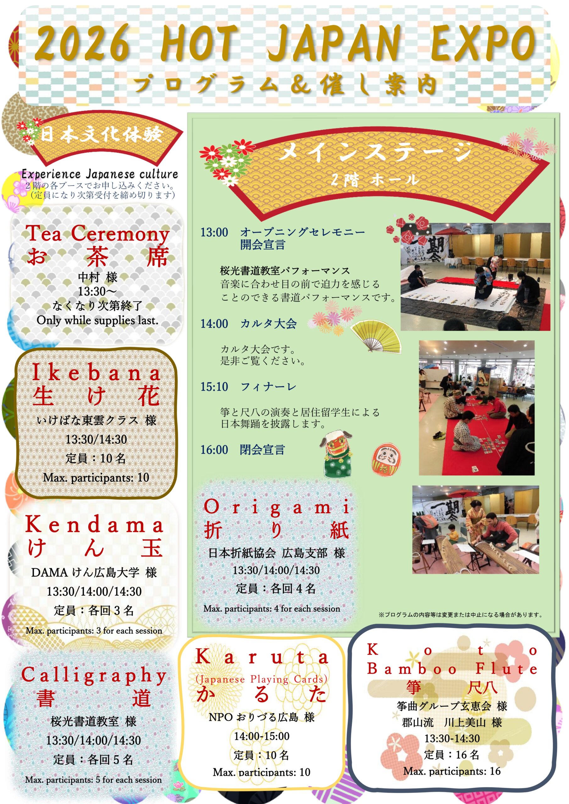 HOT JAPAN EXPOのプログラム&催し案内 2026年1月11日(日)に開催されるHOT JAPAN EXPOのプログラムと催しのご案内です。 12時30分から来館者の方にお菓子をプレゼント!なくなり次第終了ですので、お早めにお越しください! みなさまのお越しを心よりお待ち申し上げます。