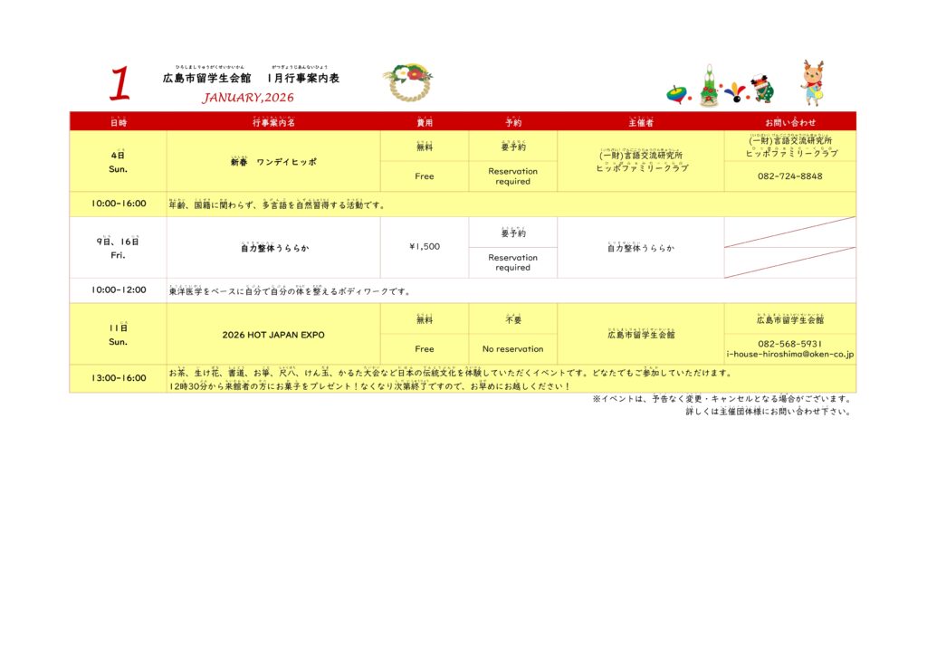 2026年1月の行事案内を掲載いたします。